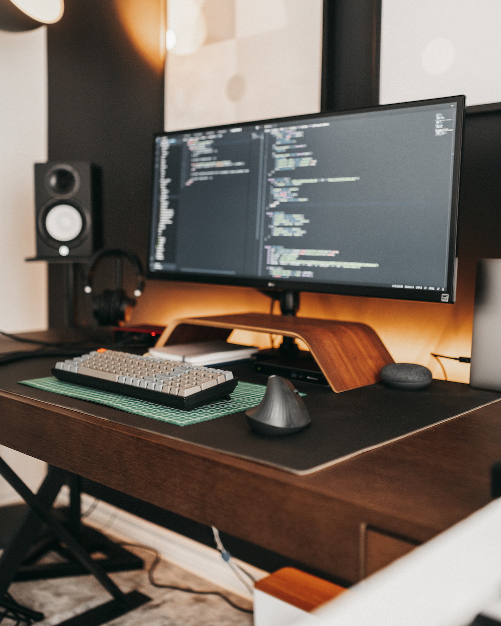 My chair and desk were chosen purely based on aesthetics, however, the size of my desk was a big deciding factor. I needed something with a lot of space to put headphones, notebooks, an audio interface, and a thunderbolt system. Being mindful of the real estate you have to work with, and what requirements you have for them will go a long way in helping make a decision on desk sizes.